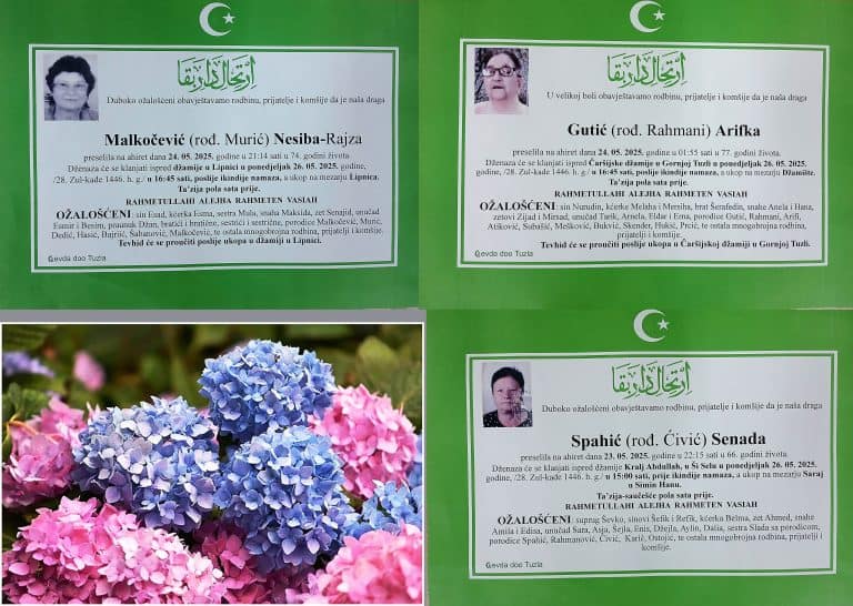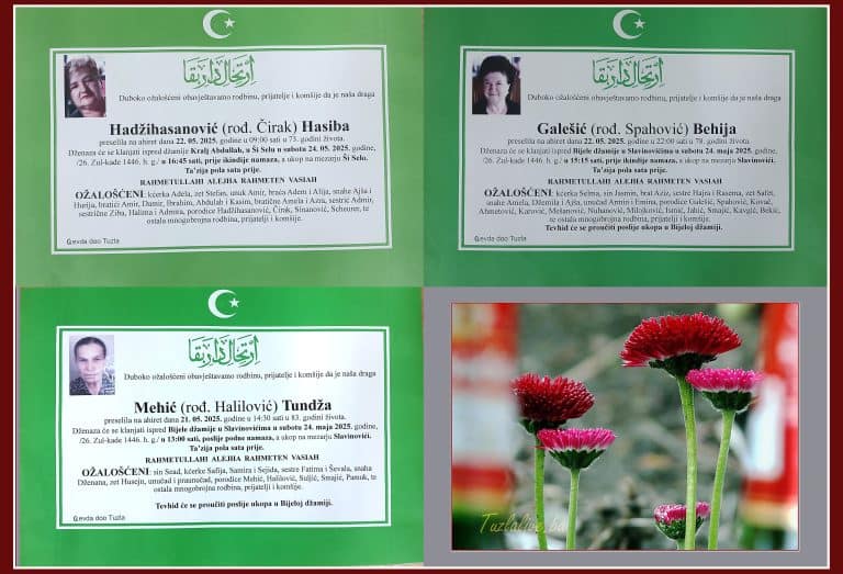 Preminulo je više naših sugrađanki, komšinica i prijateljica. Upućujemo im posljednji pozdrav. Mir dušama njihovim. Laka im bh. zemlja. Porodicama saučešće i sabur