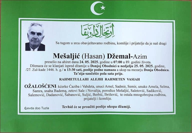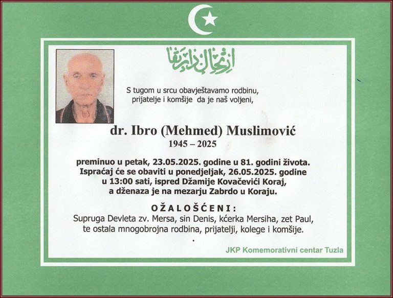 Ispraćaj će se obaviti u ponedjeljak, 26. maja 2025. godine. Mir duši njegovoj. Laka mu bh. zemlja