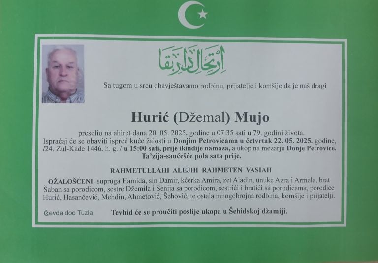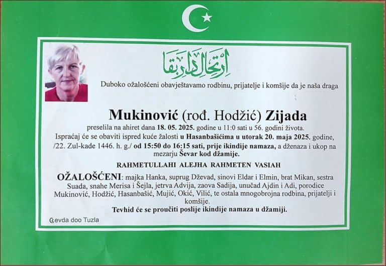 Dženaza će se klanjati ispred Džindijske džamije u Tuzli, u subotu, 17. maja 2025. godine, a ukop je na mezarju Bukovčići