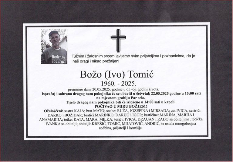 Prerano nas je, u 65. godini, napustio Božo (Ive) Tomić. Počivao u miru Božjem. Laka mu bh. zemlja...