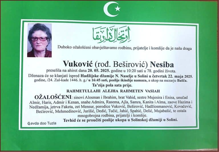 Dženaza će se klanjati ispred Hadžijske džamije N. Naselje u Solini, u četvrtak, 22. maja 2025. godine, u 16.45 sati...