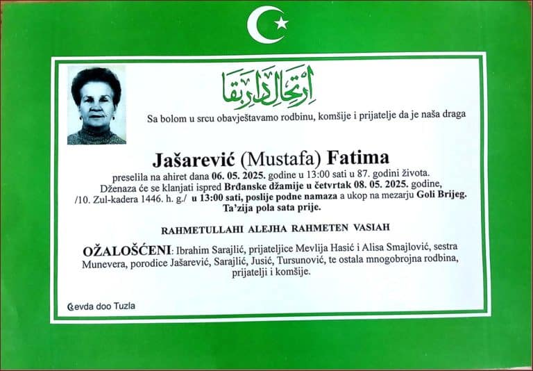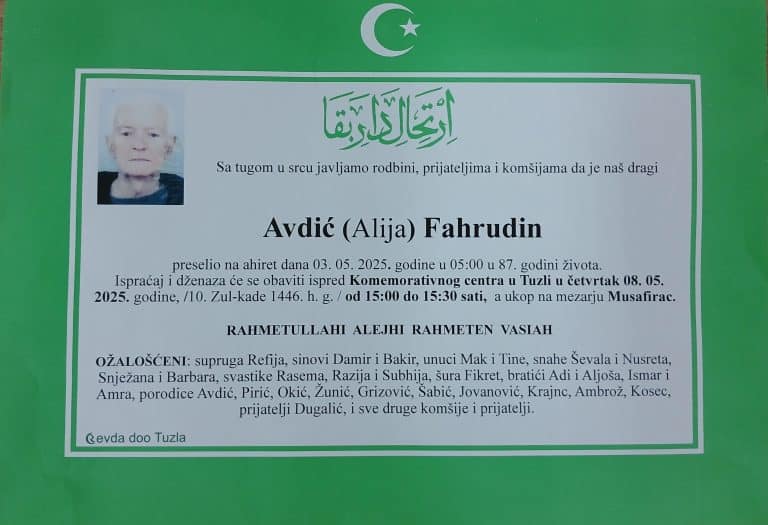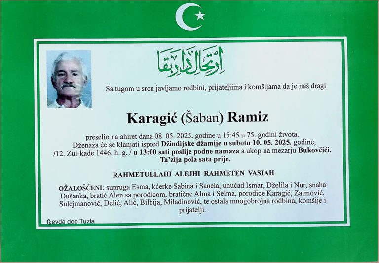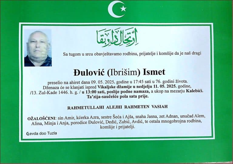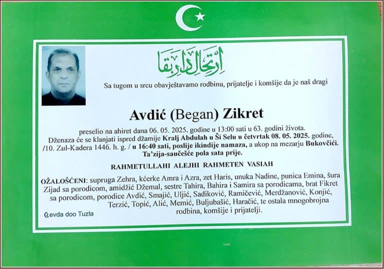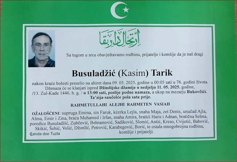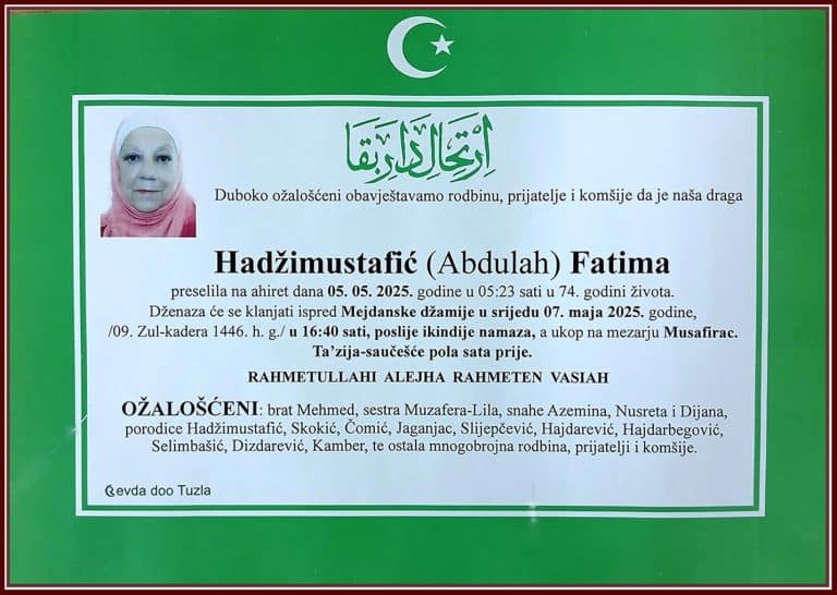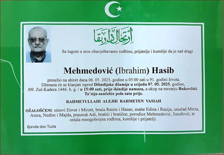 Dženaza će se klanjati ispred Vikaljske džamije u Tuzli, u nedjelju, 11. maja 2025. godine, a ukop je na mezarju Kalebići
