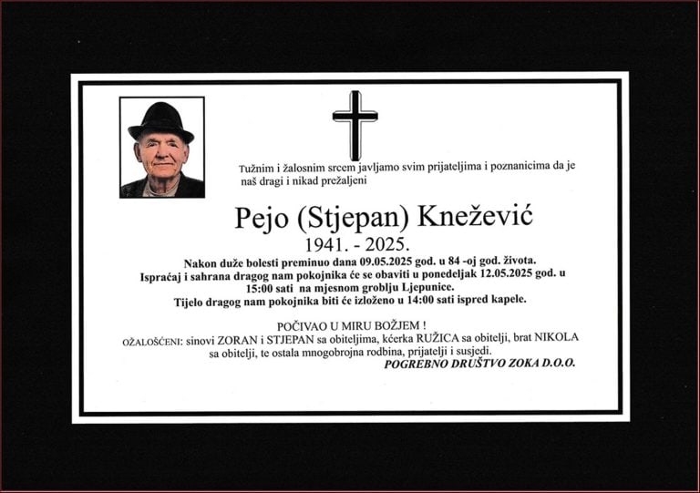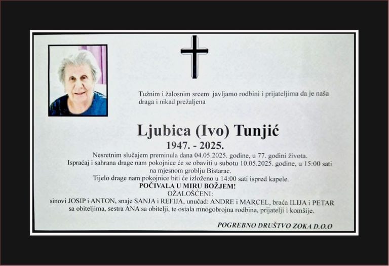Ispraćaj i sahrana obavit će se u ponedjeljak, 12. maja 2025. godine, na mjesnom groblju u Ljepunicama, u 15 sati...