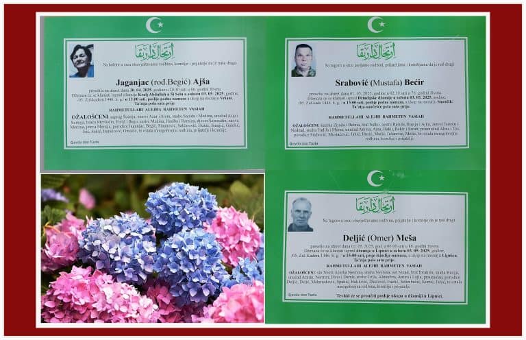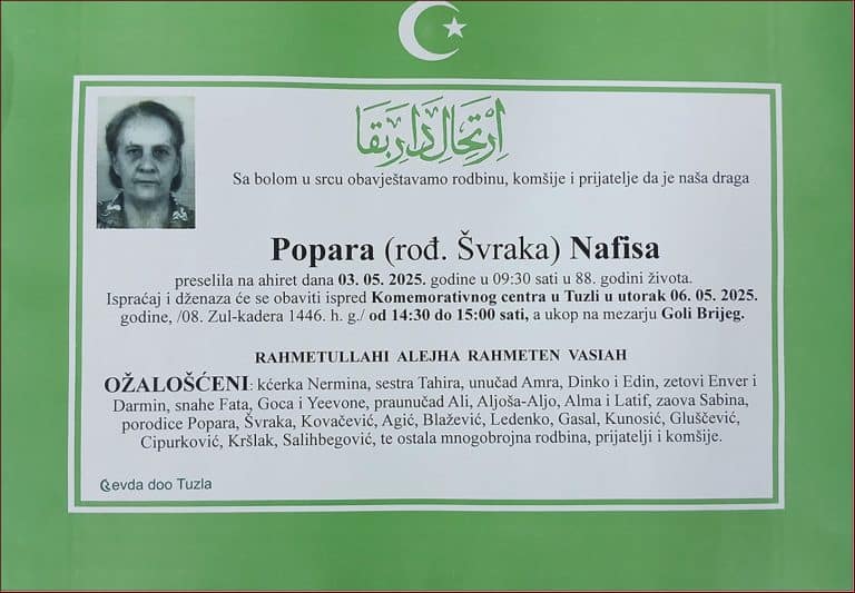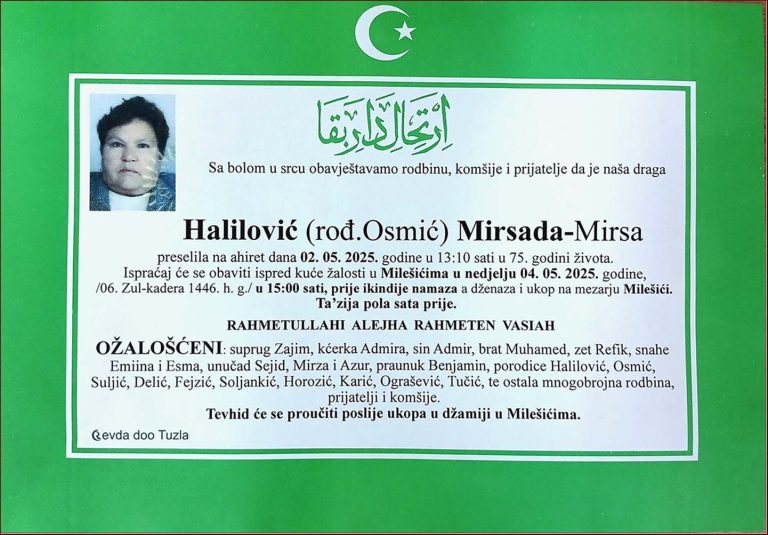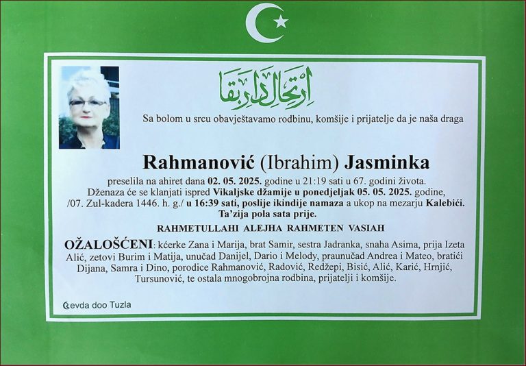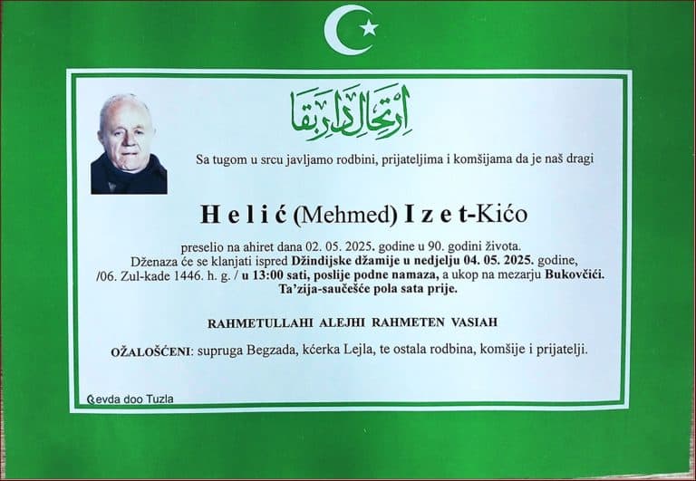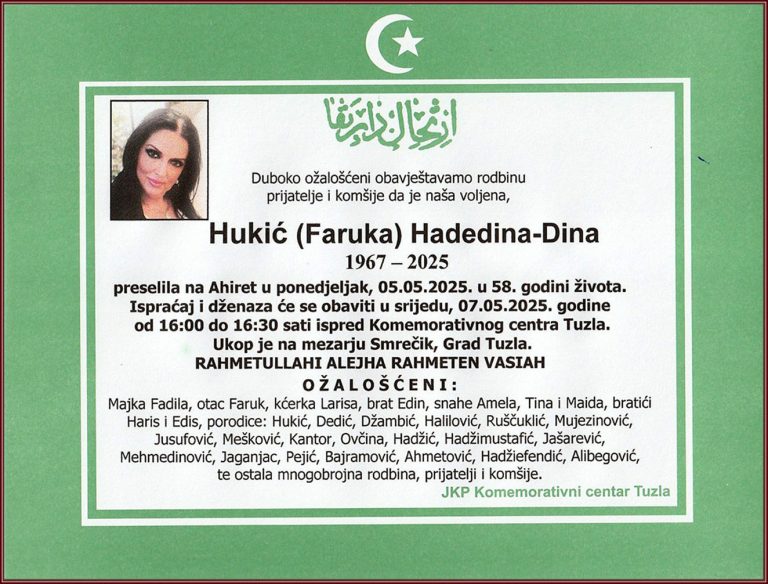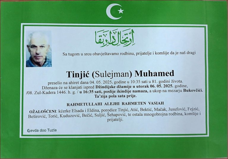 Dženaza će se klanjati ispred Džindijske džamije u Tuzli, u nedjelju, 4. maja 2025. godine, u 13 sati, a ukop je na mezarju Bukovčići