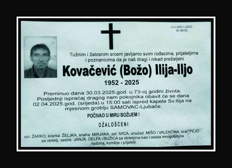Ispraćaj i sahrana obavit će se u ponedjeljak, 24. novembra 2024. godine, u 13:00 sati, na mjesnom groblju u Ljepunicama
