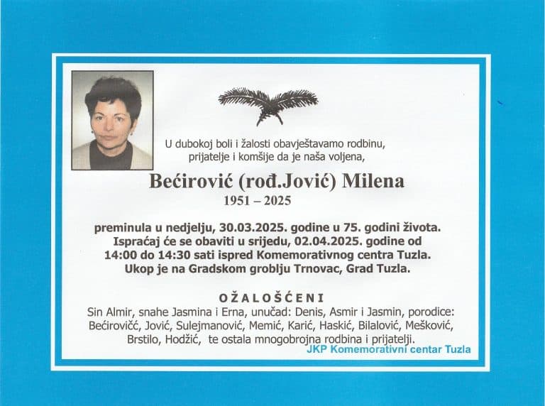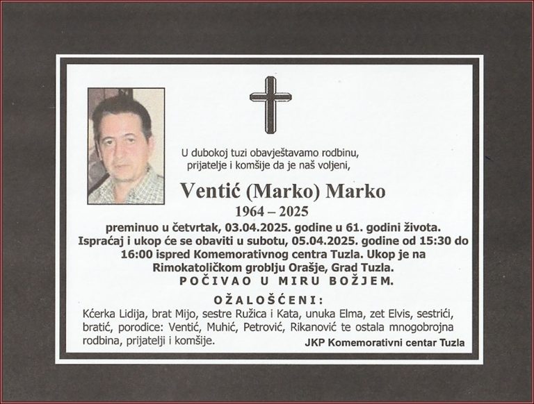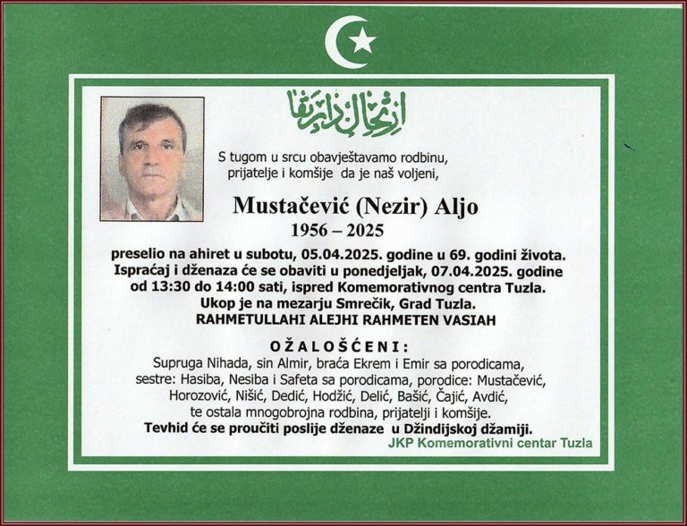 Ispraćaj pokojnika obavit će se u subotu, 22. novembra 2025. godine, od 12:30 do 13:00 ispred Komemorativnog centra Tuzla