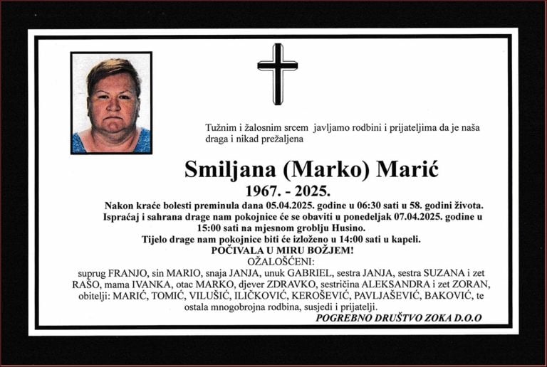 Prerano je, u 54. godini, preminula Marijana (Nikole) TADIĆ. Upućujemo joj posljednji pozdrav. Počivala u miru Božjem. Laka joj bh. zemlja...