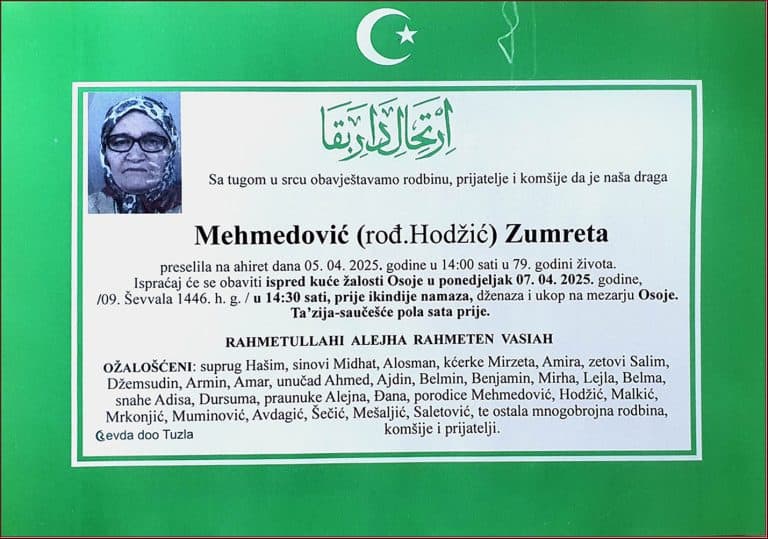 Dženaza će se klanjati u srijedu, 26. novembra 2025. godine, ispred Džindijske džamije u Tuzli, u 13:55 sati. Ukop je na mezarju Borić