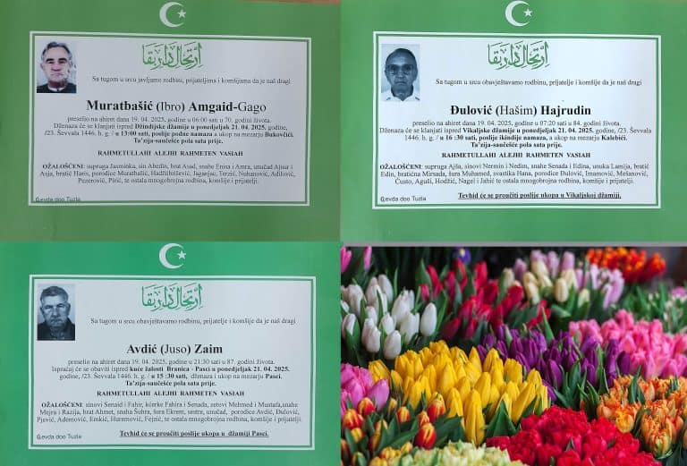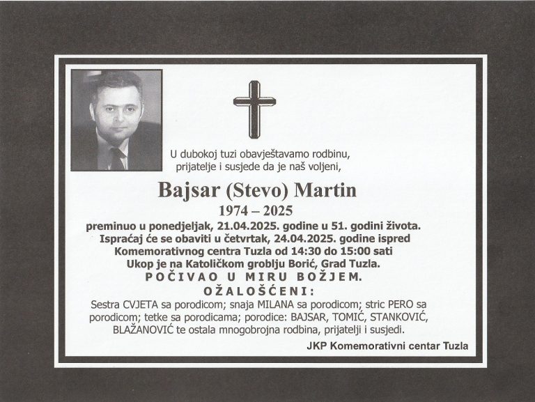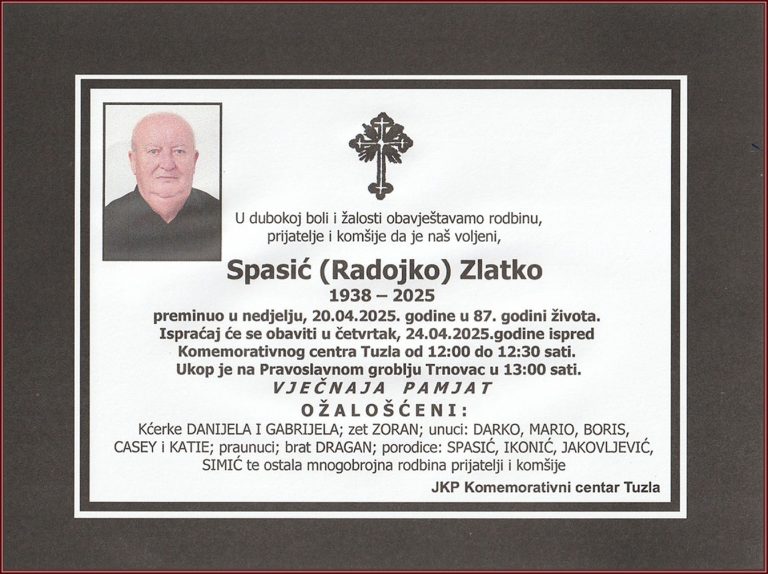 Ispraćaj će se obaviti u četvrtak, 24. aprila 2025. godine, ispred Komemorativnog centra u Tuzli, od 12:00 do 12:30 sati...