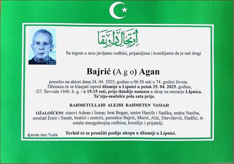 Preselio na ahiret u 74. godini. Dženaza će se klanjati ispred džamije u Lipnici u petak, 25. aprila 2025. godine...