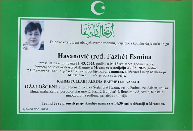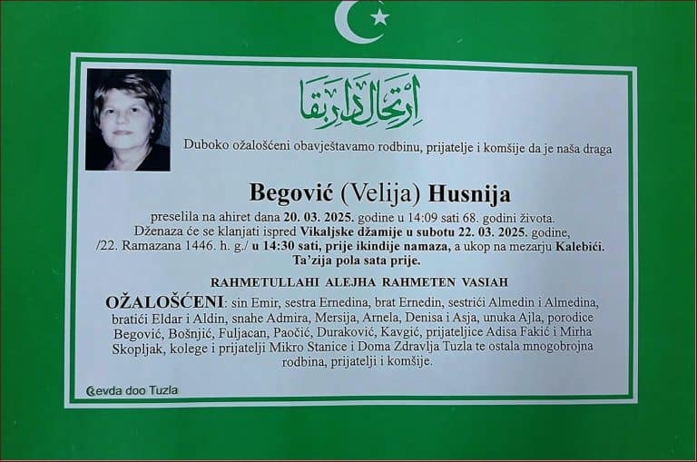 Dženaza će se klanjati u utorak, 25. marta 2025. godine, ispred Džindijske džamije u Tuzli, dok je ukop na Gradskom groblju Trnovac