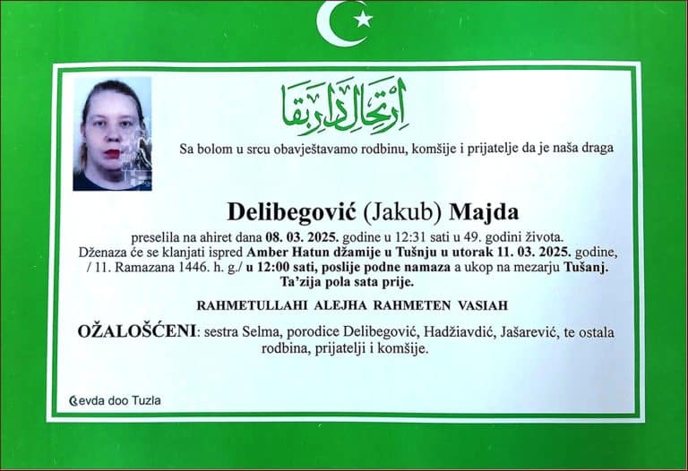 Vrlo mlada nas je, u 49. godini, napustila Majda (Jakuba) Delibegović. Upućujemo joj posljednji pozdrav. Neka je rahmet njenoj duši. Laka joj bh. zemlja...