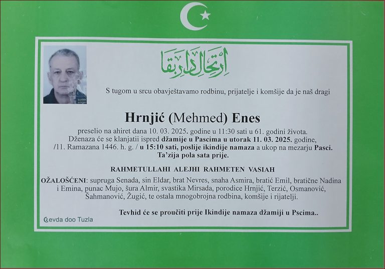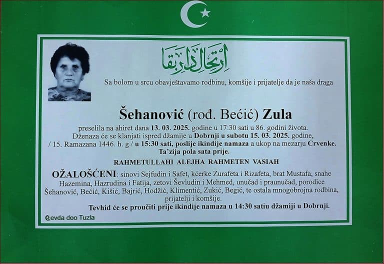 Dženaza će se klanjati ispred džamije u Dobrnji, u subotu, 15. marta 2025. godine u 15:30 sati