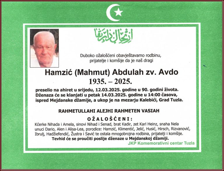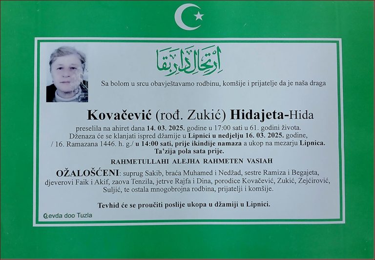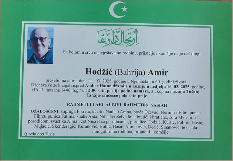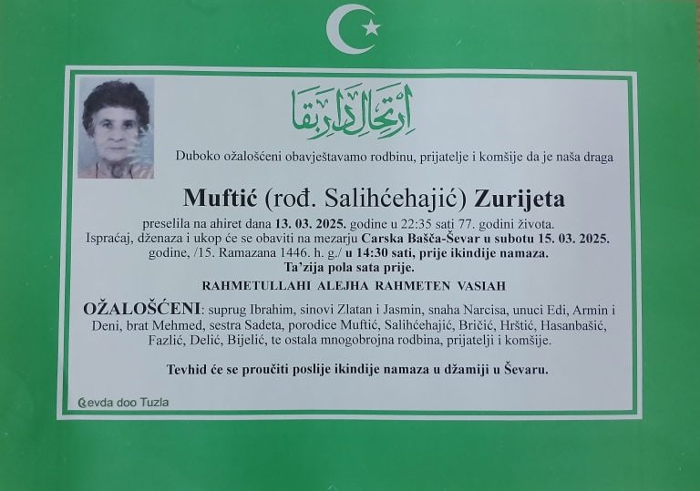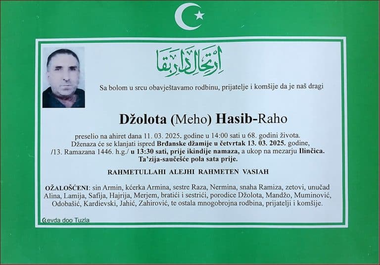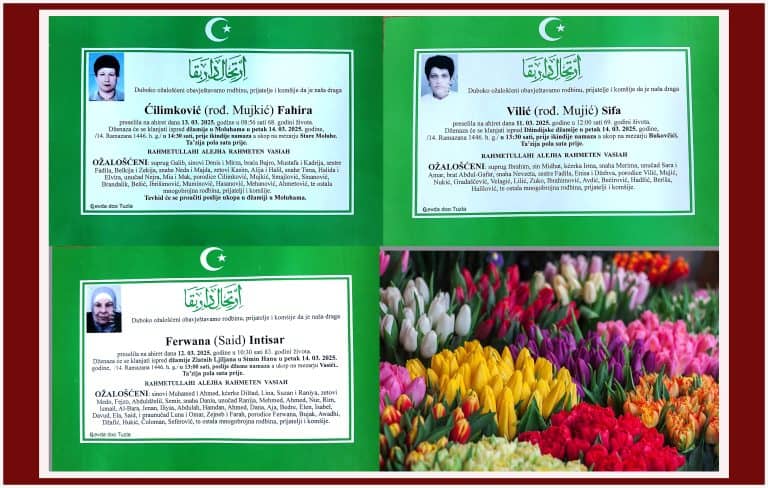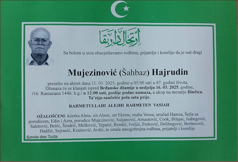 Dženaza će se klanjati ispred Brdžanske džamije u Tuzli, u nedjelju, 16. marta 2025. godine