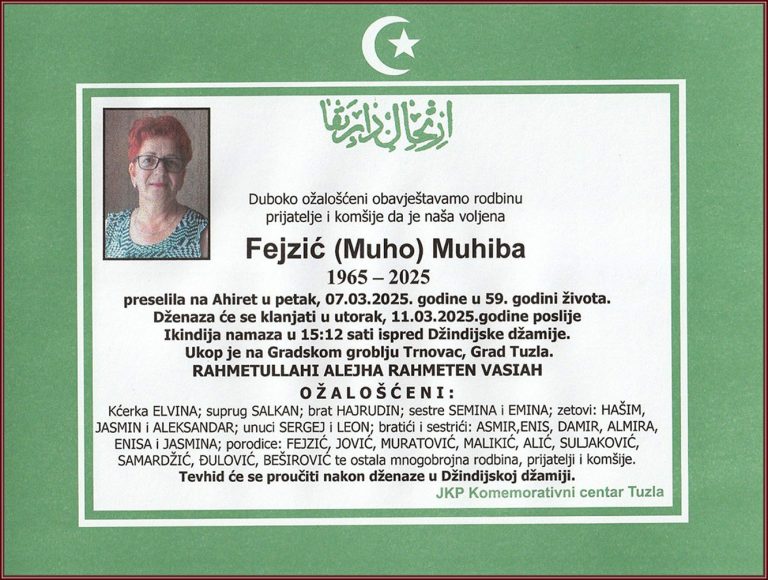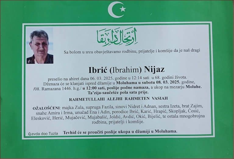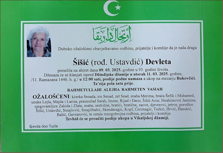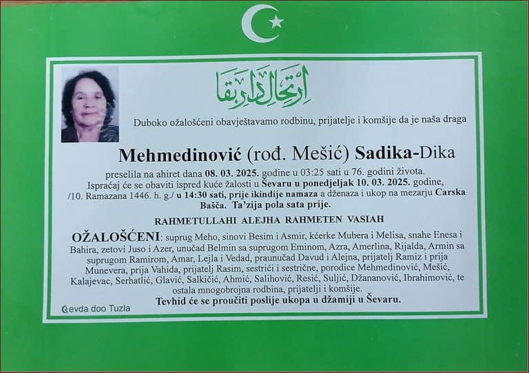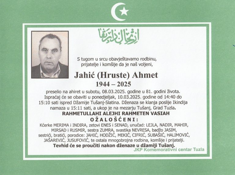 Ispraćaj će se obaviti u ponedjeljak, 10. marta 2025. godine, ispred džamije Tušanj - Slatina...