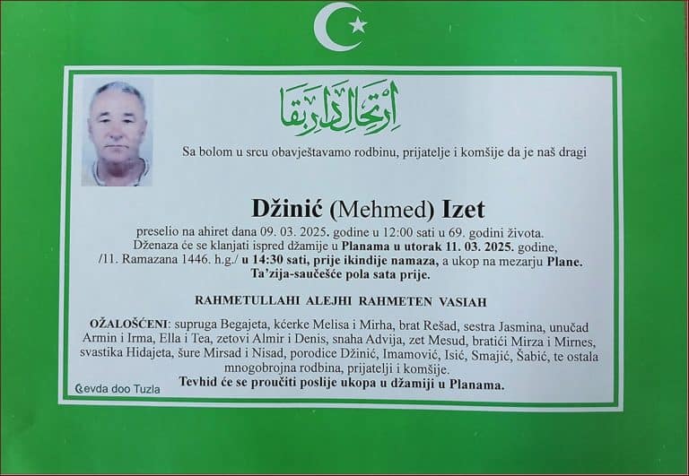 Dženaza će se klanjati ispred džamije u Planama, u utorak, 11. marta 2025. godine u 14:30 sati...