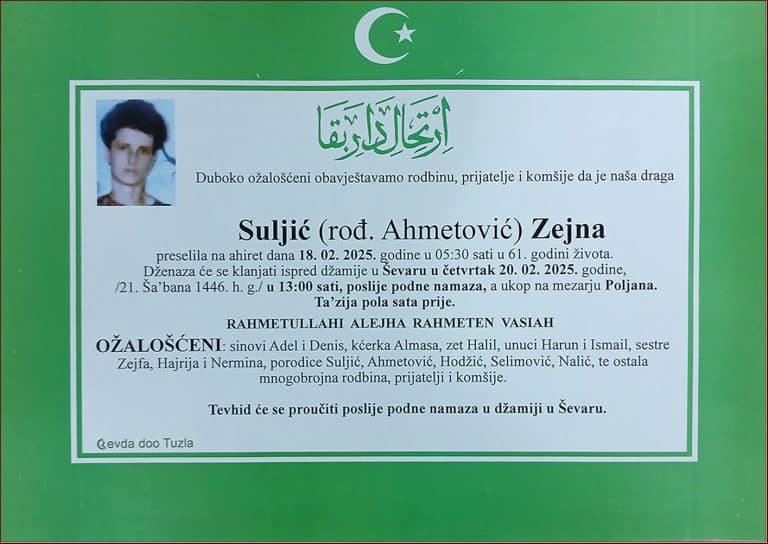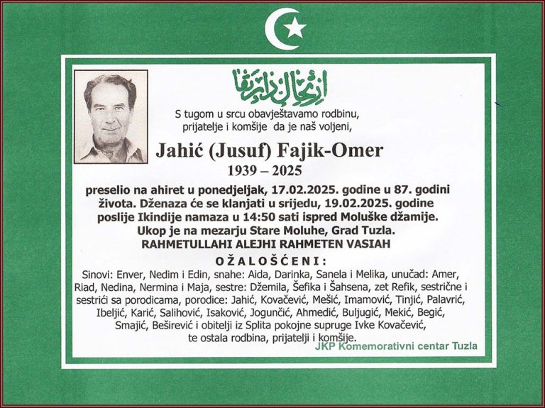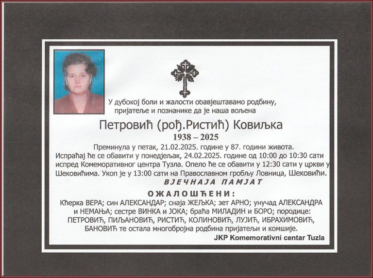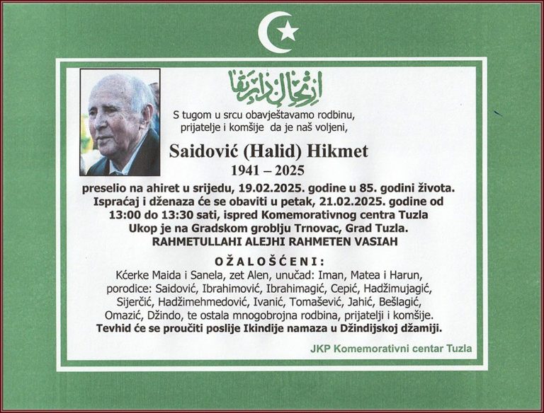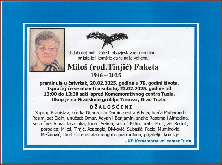 Ispraćaj će se obaviti u ponedjeljak, 24. februara 2025. godine, ispred Komemorativnog centra u Tuzli...