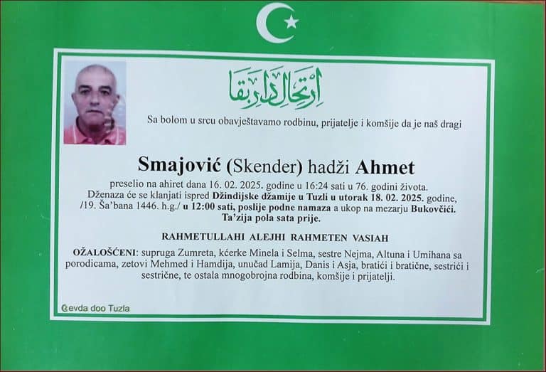 Preminuo je u 76. godini naš sugrađanin i prijatelj, Ahmet (Skendera) Smajović. Upućujemo mu posljednji pozdrav. Mir duši njegovoj. Laka mu bh. zmlja...