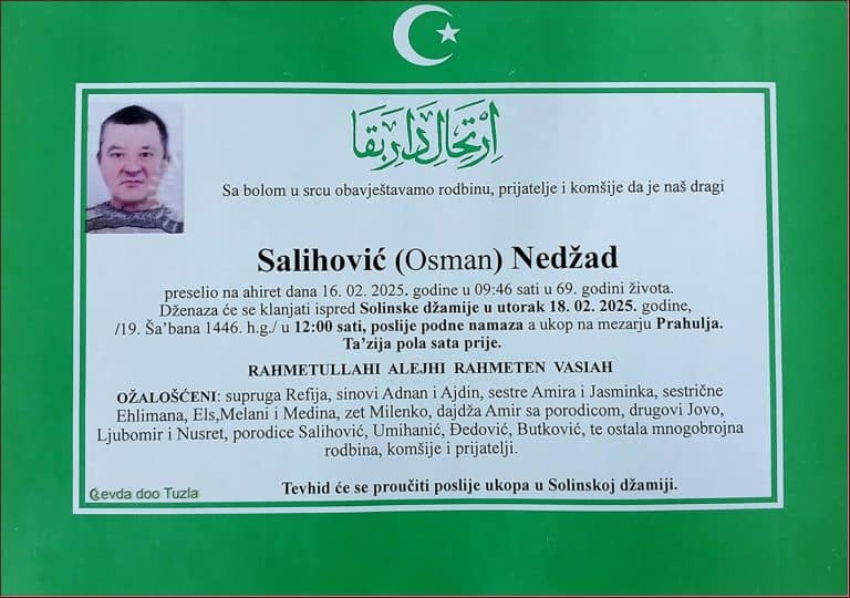 Dženaza će se klanjati ispred Solinske džamije, u utorak, 18. februara 2025. godine, u 12 sati...