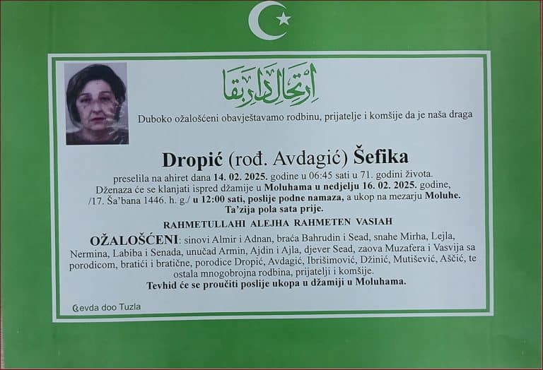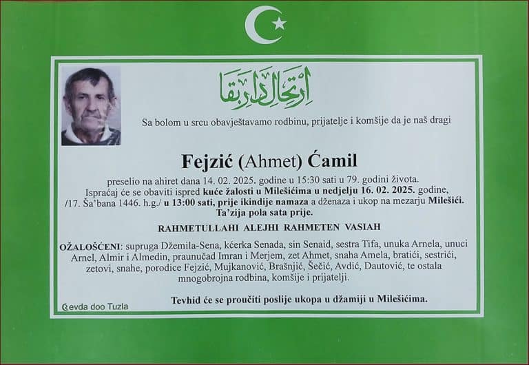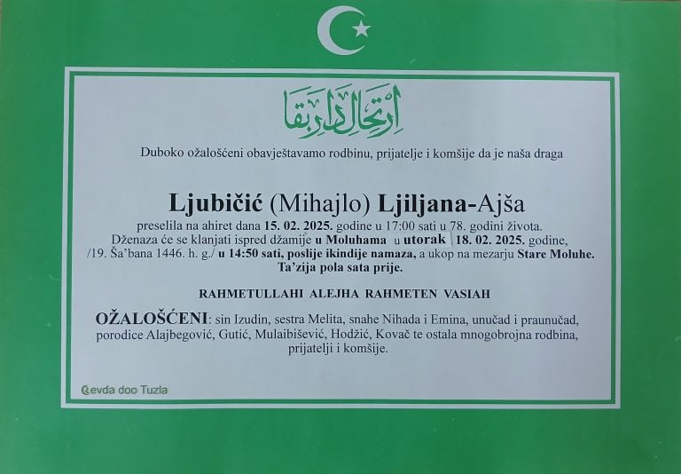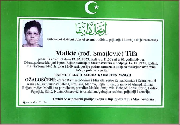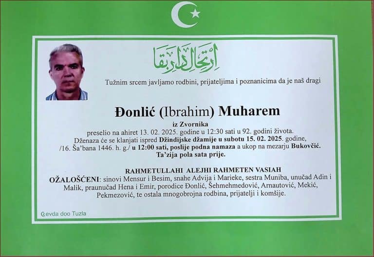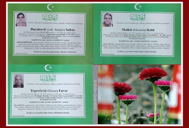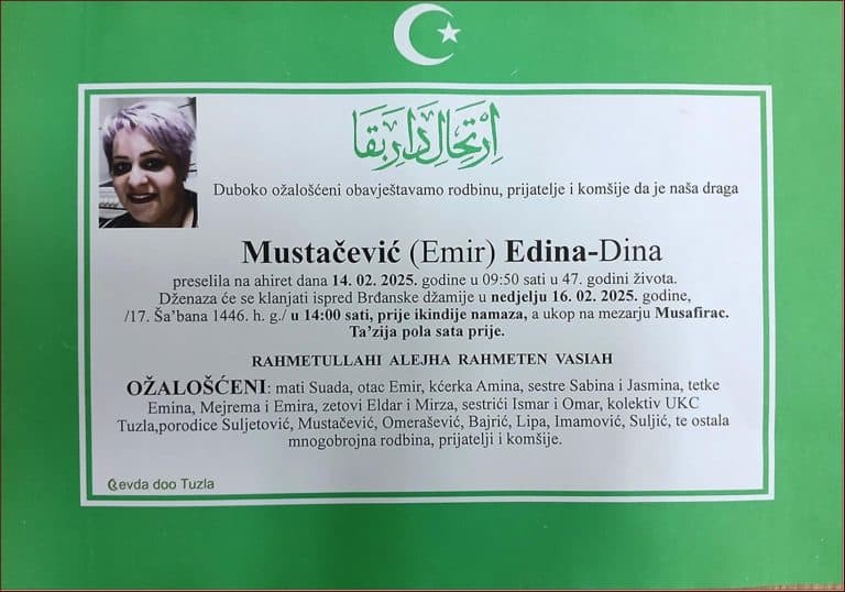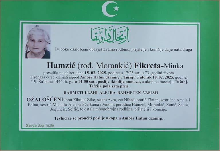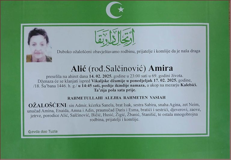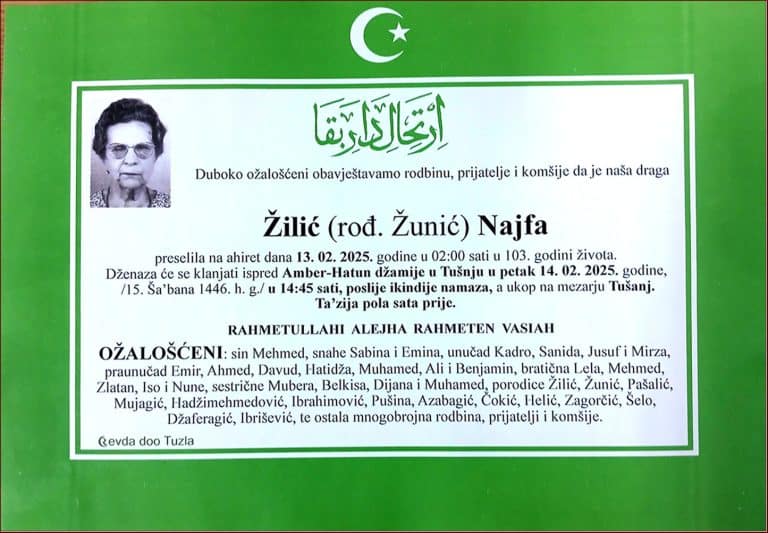 Dženaza će se klanjati ispred Vikaljske džamije u Tuzli, u ponedjeljak, 17. februara 2025. godine...