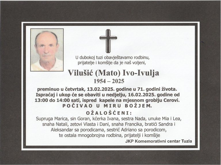 Ispraćaj i ukop će se obaviti u nedjelju, 16. februara 2025. godine, ispred kapele na mjesnom groblju Cerovi...
