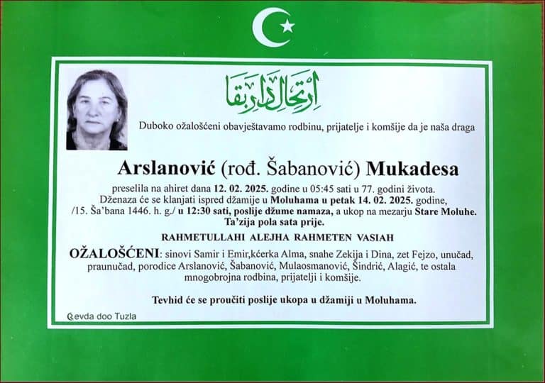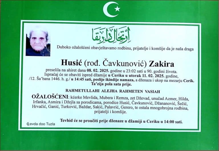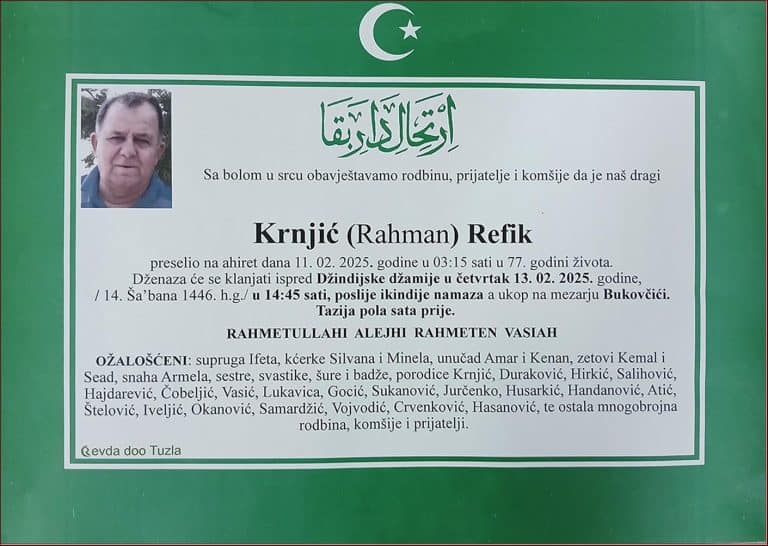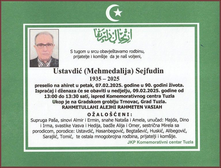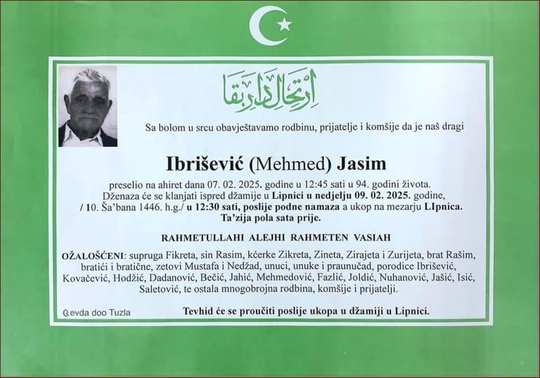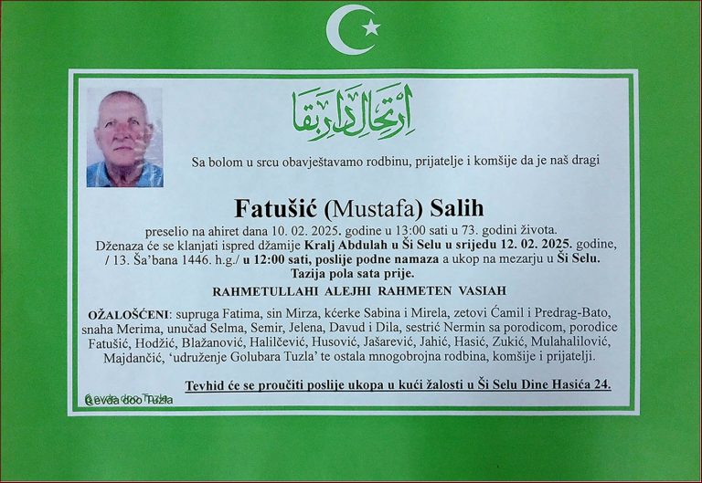 Dženaza će se klanjati ispred Džindijske džamije u Tuzli, u četvrtak, 13. februara 2025. godine, a ukop je na mezarju Bukovčić