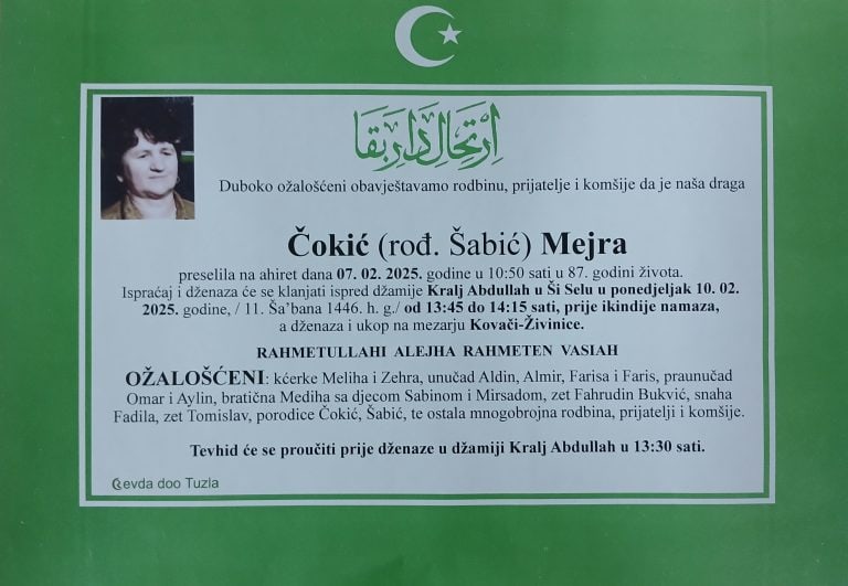 Ispraćaj i dženaza će se klanjati ispred džamije Kralja Abdulaha u Ši Selu, u ponedjeljak, 10. februara 2025. godine...