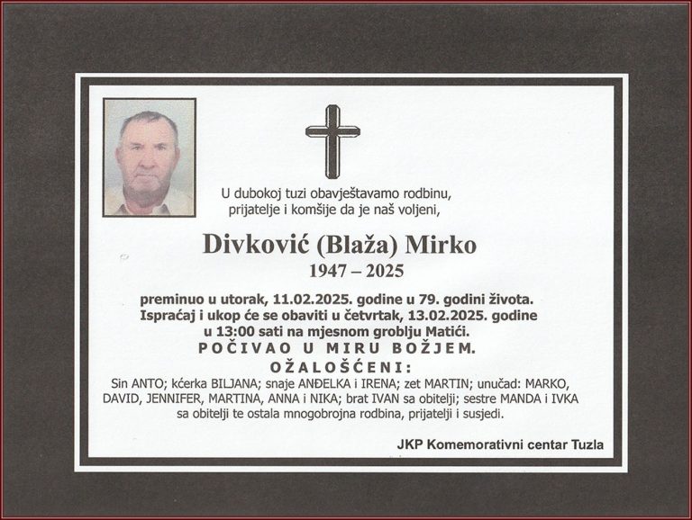 Preminuo je u 79. godini Mirko (Blaža) Divković. Počivao u miru Božjem. Laka mu bh. zemlja...
