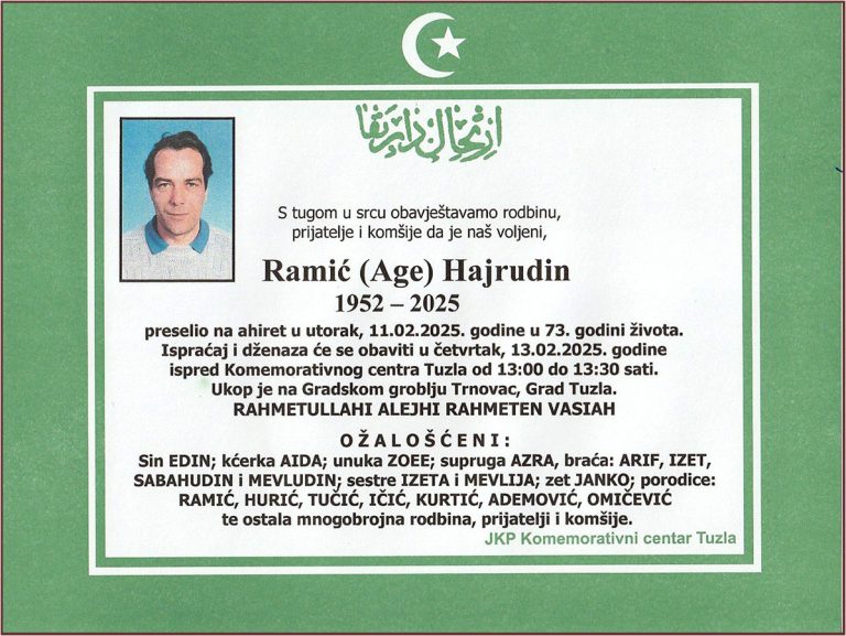 Preminuo je u 73. godini naš sugrađanin, komšija i prijatelj, Hajrudin (Age) Ramić. Upućujemo mu posljednji pozdrav. Mir duši njegovoj. Laka mu bh. zemlja...