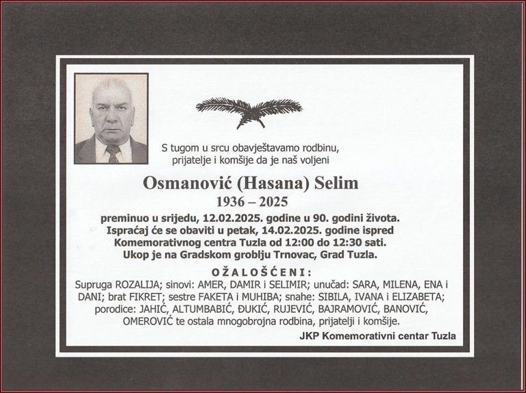 Preminuo je naš sugrađanin, komšija i prijatelj, Selim (Hasana) Osmanović. Upućujemo mu posljednji pozdrav. Neka mu je vječna slava i hvala. Laka mu bh. zemlja...