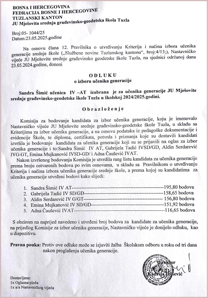 Titulu učenika generacije JU MS Građevinsko-geodetske škole generaciju 2021/2025 ponijela je Sandra Šimić, učenica četvrtog razreda, smjer arhitektonski tehničar, saopćeno je iz spomenute Mješovite srednje škole.