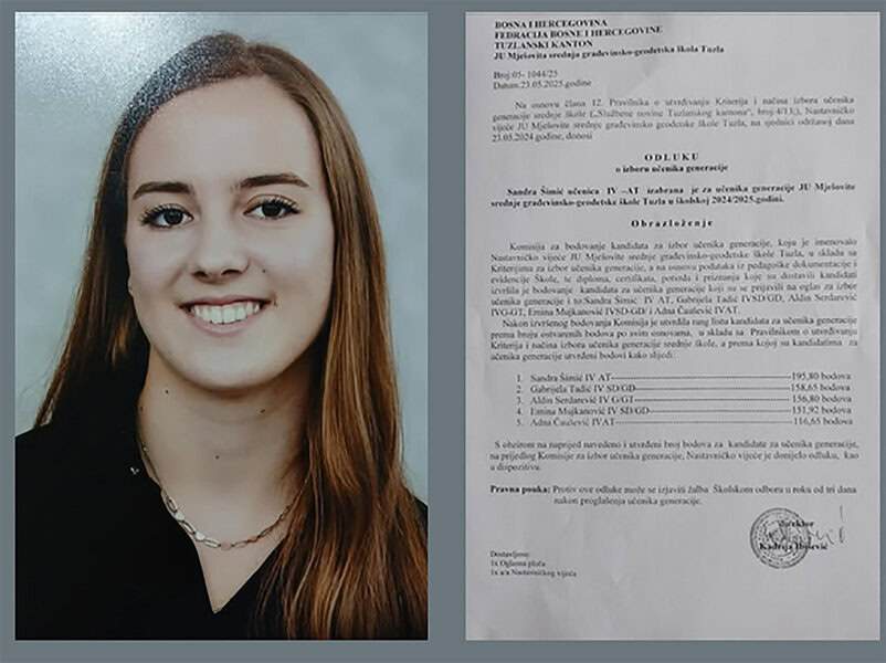 Sretno u budućnosti – ponosni smo što si bila dio naše škole!”, javna je čestitka JU MS Građevinsko-geodetske šđkole iz Tuzle upućena učenici generacije. (t)