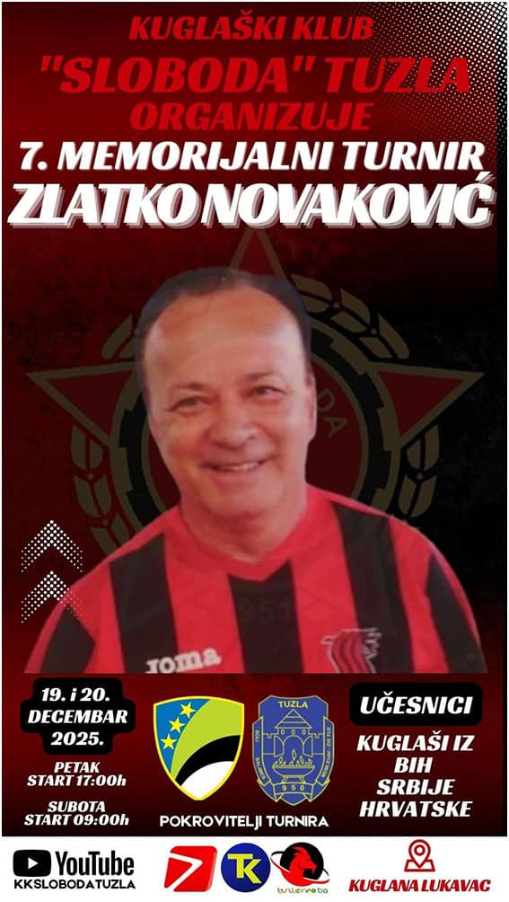 Kuglaški klub Sloboda Tuzla organizuje 7. memorijalni međunarodni turnir “Zlatko Novaković” koji će se održati 19. i 20. decembra 2025 godine u Lukavcu – Kuglana, u sklopu Centra za kulturu Lukavac.