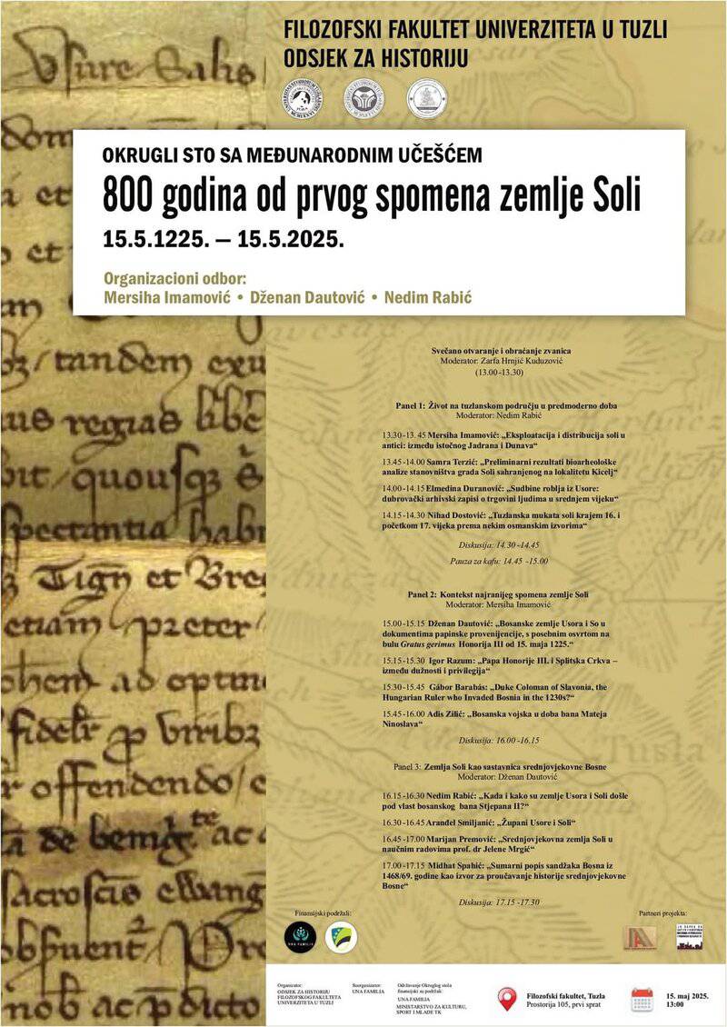 Odsjek za historiju Filozofskog fakulteta Univerziteta u Tuzli organizuje ‘okrugli sto’ povodom 800. godišnjice prvog spomena zemlje Soli u pismu pape Honorija III iz 1225. godine.