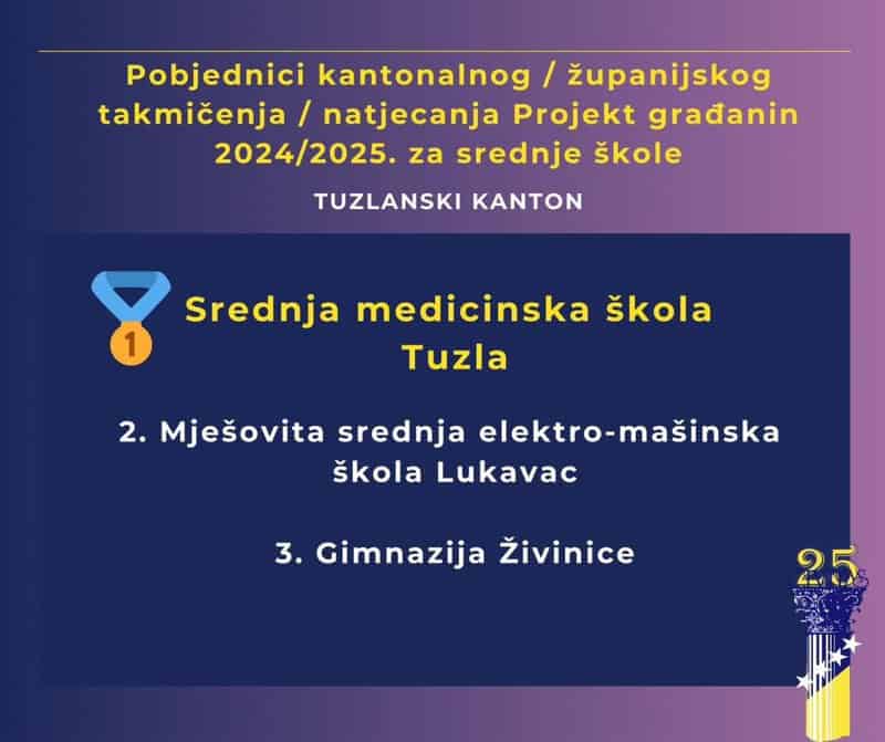Učenici III-3D razreda Srednje medicinske škole Tuzla ostvarili su izvanredan uspjeh osvojivši prvo mjesto na kantonalnom takmičenju iz oblasti građanskog obrazovanja, u okviru projekta građanin, čime su se plasirali na federalno takmičenje koje će se održati ovog mjeseca.