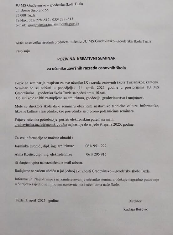 Javna ustanova Mješovita srednja Građevinsko-geodetska škola Tuzla sutra, 14. aprila 2025. godine, obilježit će Dan škole.
