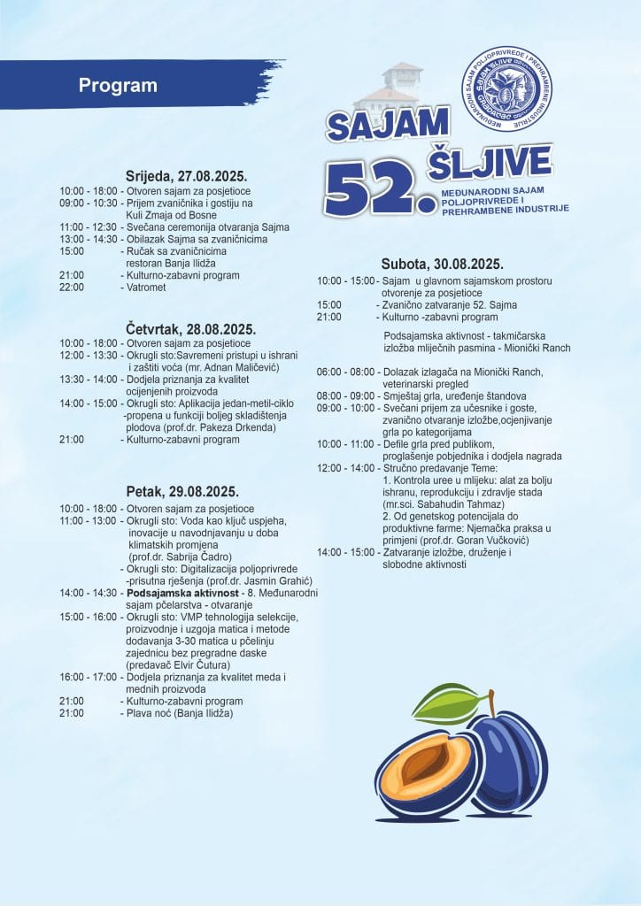 U srijedu, 27. avgusta, je svečana ceremonija otvaranja 52. Sajma šljive, a prije svečane ceremonije otvaranja Hajrudin Mehanović, gradonačelnik Gradačca, organizovat će prijem za zvaničnike i goste na Kuli Husein-kapetana Gradaščevića.