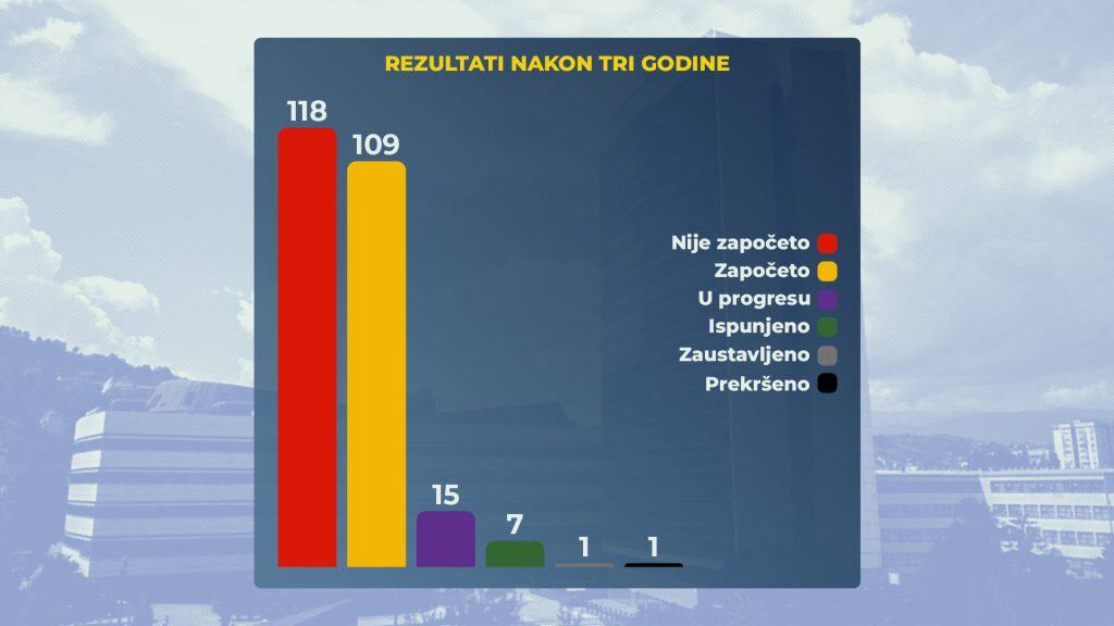 Nakon tri godine mandata, od ukupno 251 obećanja, u potpunosti je ispunjeno sedam obećanja, dok je ispunjavanje njih 15 ocijenjeno kao u progresu. Započete su aktivnosti na realizaciji 109 obećanja, dok najveći broj obećanja, njih 118, i poslije tri godine mandata ima status nezapočetih.