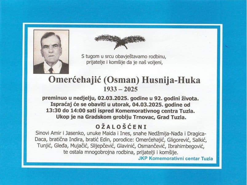 U Tuzli je u nedjelju, u 92. godini, preminuo Husnija (Osmana) Omerćehajić – Huka, istaknuti tuzlanski intelektualac, privrednik i sportski radnik.