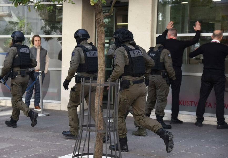 Policajci su, kako se moglo vidjeti tokom akcije, pretresali i držali sa rukama u vis i zaštitare koji rade u Prvoj banci.