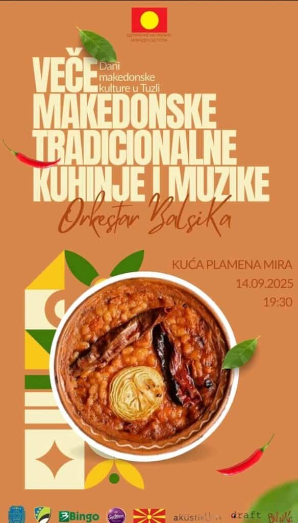 U sklopu manifestacije “Dani makedonske kulture”, u Kući plamena mira u Tuzli sinoć je održano veče posvećeno tradicionalnoj makedonskoj kuhinji i muzici. Posjetioci su imali priliku degustirati autentična jela i uživati u zvucima makedonskog folklora, što je događaju dalo poseban ugođaj.