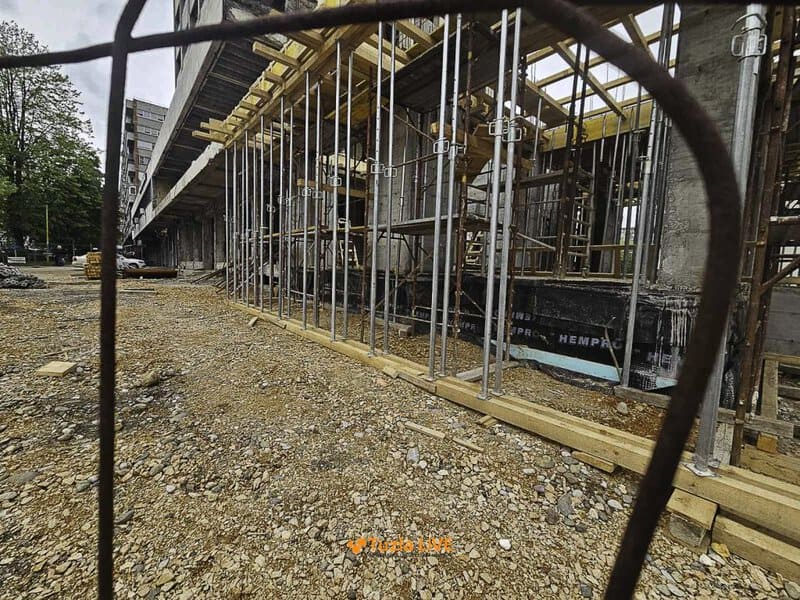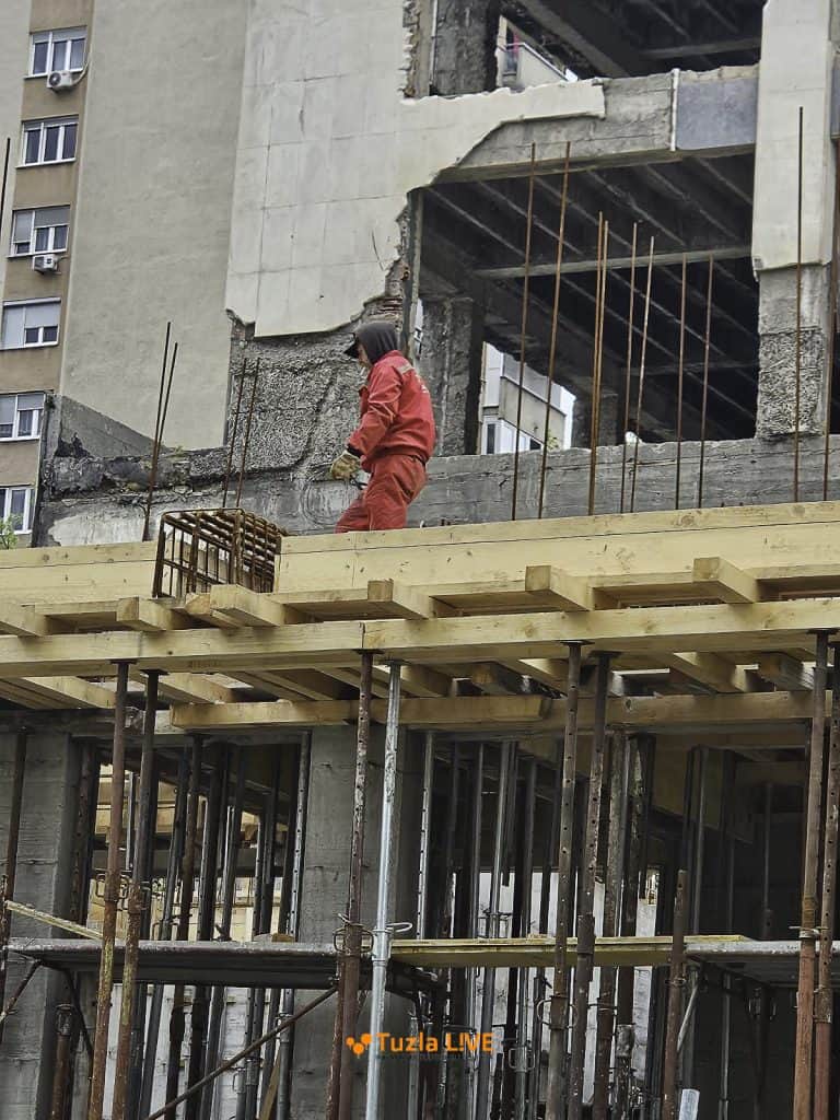 Uglavnom, vrijeme prolazi a na gradilštu se s vremena na vrijeme vidi da se nešto radi. Kao ovih dana kada se kao izlog za slikanje postavljaju grede i nekakva konstrukcija od metalnih cijevi. Malo je i radnika, pa smo danas oko 14 sati vidjeli tek jednog kako ‘špaciora’ terasom zgrade.