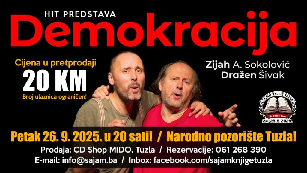 Glumac Zijah Sokolović ponovo se druži sa publikom u Tuzli i to  sa svojom kabaretskom predstavom “Demokracija”, u kojoj uz njega igra i glumac Dražen Šivak, te promocijom njegove knjige “GLUMAC… JE GLUMAC… JE GLUMAC”.